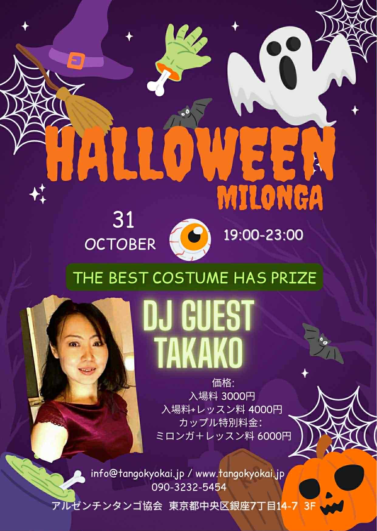 10/31(金)はハロウィンミロンガ🎃お気に入りのコスチュームでご参加ください🎃こちらのDj はTakako♫です!
